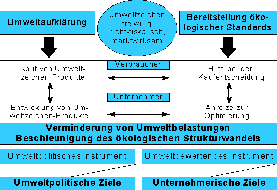 Das Umweltzeichen zählt zu den umweltpolitischen Instrumenten, es beruht jedoch auf freiwilliger Basis.6 Der Zeichennehmer erlangt durch den Blauen Engel Wettbewerbsvorteile, da dieser dem Verbraucher eine transparent gehaltene Aussage |